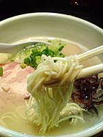 スープの方は博多風の乳化したもの。口当たりマイルドですが、ちょっとザラザラする舌触りと、ほのかな香りは「博多っ子」風でしょうか。ん〜。ちょっと好みの方向とは違います。でも丁寧に取られたスープだなぁと言う印象は強く、雑味がないかんじで取っつきやすい感じはします。