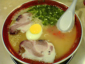 具はチャーシュー、ゆで卵半分、万能ネギ、紅ショウガ。豚骨臭含め、全体的に[葉隠]に似ているかな。