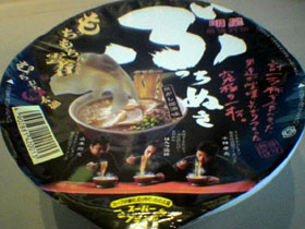 なんだかバランス悪いんですよね。麺は無意味に主張しすぎだし、何故ワンタンが入ってるんだかも良く分からないし。そんなことよりもレトルトの味玉でも入ってた方が嬉しいです。スーパーノンフライって言う画期的な技術で乾燥してるらしいんだけど活かされて無い感じします。あーだこーだ能書きいっぱいタレてる割には何をこだわったんだか良くわからないカップ麺になってるかと。こう言う中途半端な本物志向って言うのは逆にマズいだけで、インスタントならインスタントらしさを追求した「日清カップヌードル」方向の物の方がずっと美味しいです。まあ大げさな宣伝の駄作ってとこですかね。