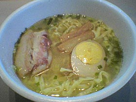 とは言っても中身はけっこうハイレベルな一品です。スープはあっさりしながらも結構旨みが凝縮されていて、素直に旨いです。麺は好みではないけど、生麺風の物で、これは好みによるかな。そして特筆すべきはレトルトの具ですね。チャーシュー、メンマ、玉子が全て同じ袋に入っています。そのためか、玉子が特に旨いですね。カップの味玉で初めて旨いと思いました。チャーシューはちょっとポソポソしてますが、カップ麺では上出来でしょう。