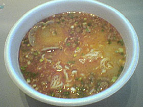 スープははやり美味しくないです。カップの豚骨はムズかしいんでしょう。全然豚骨っぽくないです。「かさね味」は豚骨らしいとは言いにくかったけど美味しかったのに、今回のは美味しくない。残念。麺は例によって細いながらもツルツルの縮れ麺。一風堂の面影もないですね。「日清担々麺」とか、そんな名前で売ってても誰一人として「ん?これは一風堂っぽいんじゃないの?」なんて脳裏をかすめもしないはず。