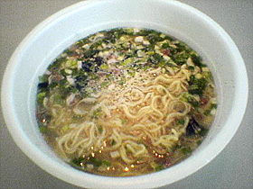 スープの方はちょっと豚骨っぽい臭いのする物。こちらは結構普通のインスタントスープかな。調味油に醤油味が付いているのでさしずめ豚骨醤油とでも言ったところでしょうか。ちょっとしょっぱ目ですかね。