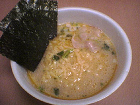 スープは液体+粉ですが、黄色みが強くすぎてちょっと変な色ですね。もうちょっと赤褐色な方が家系らしい見た目になるんじゃないでしょうか。やはりインスタントと言った感じで家系らしい豚骨醤油の味は再現しきれていません。しかし油の量が多いのでこってっり感は出ています。