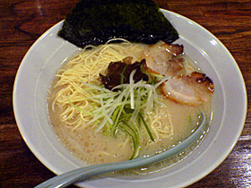 ビジュアル的には細切りのネギが若干の違和感を演出していますが、それ以外はオーソドックスな博多風。スープはかなーーーり薄いながらも豚骨らしい甘みが出ています。濃厚とはお世辞にも言えませんが、値段を考えれば十分豚骨っぽさを楽しめる出来じゃないかとおもいますよ。まろやかさはありますがサラサラです。この値段なら文句は言えませんがもうちょっと濃厚なら嬉しいですね。