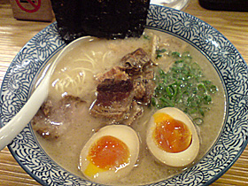 麺の方は極細とまでは行かないまでも細めのストレート。加水率は低めですが、歯ごたえやのど越しはこれまた九州風ではありません。これも下北の「頭」と同じような感じ。
