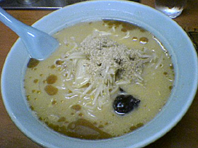 醤油と並び人気の味噌ラーメンに挑戦。ゴマだれの浮くスープはなかなか美味しい。やや酸味が強い感じがするので好みが分かれるかもしれない。