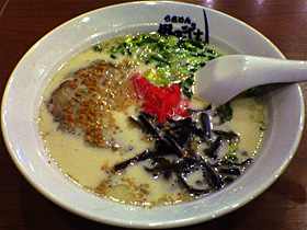 [博多天神]並の真っ白なスープにニンニクチップに黄色い麺。どうにも博多ラーメンらしくない感じです。