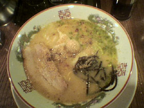 スープは薄く、九州一番風のコクも旨味も感じないもの。麺も加水率ちょっと高め。悪くはないが、スープがひどすぎかな。何故か具にキャベツが入っている。
