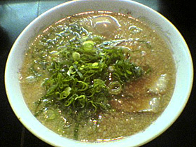 背脂の良は「スズキヤスオ」よりも少く見えましたが、スープの量が多いので、実際には同じくらいかもしれません。しかしスープを啜ってみて明らかにインパクトに欠ける感じがしました。また麺は加水率の高い物でこれは「スズキヤスオ」と違うんじゃないのかなと思いましたが、どうなんでしょう。玉子は僕の好きな固ゆででしたが、甘い味付けであまり好きではありませんでした。またチャーシューも硬く薄いものでした。しかし九条ネギのシャキシャキ感はかなり良い感じです。