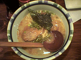 上品であっさりとした豚骨スープはマイルドで旨味も出ている。多少トロりとした感じはあるが、濃厚と言うほどではないかもしれない。麺は家系風の太いもので、コシがあって美味しいけど、このスープとはちょっと合わないような気がしないでもない。