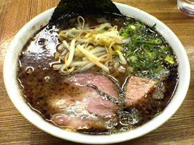 具は海苔、もやし、九条ネギ、2cm四方の角切りの赤身チャーシュー、脂身の多めのチャーシュー。もやしは油で炒めてあるのか、ちょっと香りが強めで主張しすぎな感じもします。チャーシューは角切りの方はパサパサして固いもの。脂身の多い方はトロけるような柔らかさの物で、なかなか美味しいです。