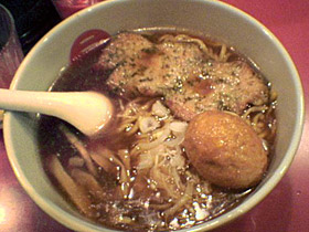 気になる具だが、玉豚天では豚肉の揚げとゆで玉子の揚げが乗る。豚肉の方は味付けされた豚にものすごく薄い衣があり、青のりがまぶしてある。らーめんが出てきた直後はサクサクした食感があるが、すぐにスープを吸い込んで柔らかくなってしまうのがちょっともったいない。玉子の方はゆで玉子をそのまま揚げたもの。うむ〜。珍しいけど玉子は揚げなくても良いかな。