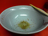 バカみたいな量ですが、今回は「○二郎@要町」での経験を活かし、ゆっくり落ち着いて食べることにしました。その結果、要町では最後の方は死ぬほど苦痛だったのですが、今回は以外とすんなり麺、ヤサイを制覇。のこるはスープの中に沈んだ数枚のブタだけ。これもちゃんと口の中を一度空っぽにして、水を飲みながら落ち着いて食べることで無事完食できました!