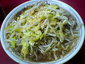 | 数ある二郎の中でも「三田本店」に最も近い味と言われる目黒店。店の外には二郎臭が漂い、ペンキで道路に描かれた矢印に従って行列が出来ています。