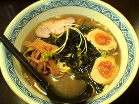 具はチャーシュー、メンマ、ワカメ、カイワレです。個人的にラーメンにワカメはあまり好きじゃないです。特にこの手の薄いスープだとどうしても主張しすぎると思うんだけどなぁ。メンマには豆板醤がまぶしてあり、ピリリと辛いです。これも薄いスープには若干主張しすぎる気もするけど、混ざらないように気をつけて、後で少しずつ混ぜていけば味の変化を楽しめるかと。カイワレは新鮮な感じでほどよいアクセントになっているし、チャーシューはトロ火で煮込んでいるとあって、風味も食感もすばらしく美味しいです。トッピング(追加)の味玉も程よい火の通り具合で味付けもしつこくなく自然で旨い。具は、ワカメ以外は結構すばらしいんじゃないでしょうか。麺もなかなかなのに、すべてはこの薄いスープとワカメによって何ともつまらない結果に終わってしまっているのがもったいないです。