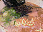 出てきたラーメンはドンブリこそ違えど、まさに[なんでんかんでん]のそれ。見るからに濃厚そうで、ブレの多い[なんでん]の調子の良い時の見た目だ。そして味の方も「おいしい時の」[なんでんかんでん]と言う感じ。かなり濃厚でおいしい。が、欲を言うならコクが足りない。甘みがほとんど感じられないのが残念なところ。あと、ほんの微妙だが豚骨の生臭さを感じる。これは他の豚骨ラーメンの店でもたまに感じる臭いで、時と場合によっては同じ店でも感じない事もある。味の薄さはカウンターのタレを投入すれば若干改善されるが、それとは別の甘みがやはり欲しい所。今後改善されていくかどうかに期待したい。
