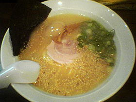 筑豊ラーメンと言うと原宿の「ばさらか」が有名ですが、こちらはばさらかとは全然違う感じのラーメンですね。スープは豚骨の他鶏ガラや魚介出汁も加えているそうですが、主として豚骨らしい白濁した物。ばさらかの様なトロんとしたタイプではなくサラサラのスープです。コクはそれほど強くなく、塩味が勝っている感じで、味自体は「柳屋」と似ていますが、濃度はもうちょっと低いです。同じく筑豊ラーメンの「山小屋」などともちょっと違う感じのスープですね。