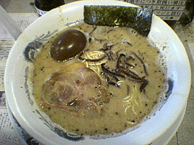 そして出てきたラーメンを見てみてびっくり!なんじゃこりゃ。普通に博多ラーメンの見た目じゃないですか。スープを啜ってみてまたまたびっくり!当然ゴマが思いっきり主張しているが、豚骨の旨味と濃度もたっぷり。こりゃ近くのインチキ「長浜ラーメン」よりもずっと長浜っぽいですよ。そこにザラザラするほどの大量のゴマ。これは他にはない食感です。