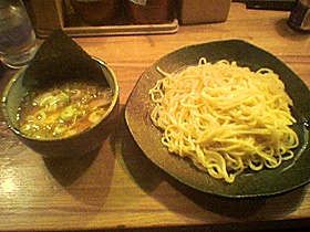 つけ汁の方は鰹節風味の強めな豚骨+鶏ガラベースの醤油味です。「九州じゃんがら」の「つけちゃん」と良く似ていますが、こちらの方が甘みが強く、かなりハッキリとした輪郭のある味ですね。分かりやすい旨さなんですが、ちょっとワザとらしすぎるかも。でも、つけ麺として食べるにはこんなもんなんですかね。